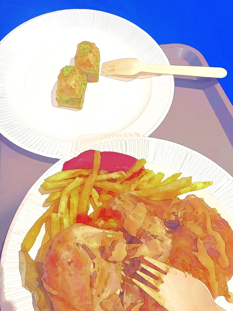 もちろん、グルメも忘れずに。ハーフチキンが3000円、バクラヴァが1200円と、さすが万博価格。でも食事スペースでは生演奏のライブが行われていて、生演奏を聴きながら食事ができる非日常的な時間を過ごせました。